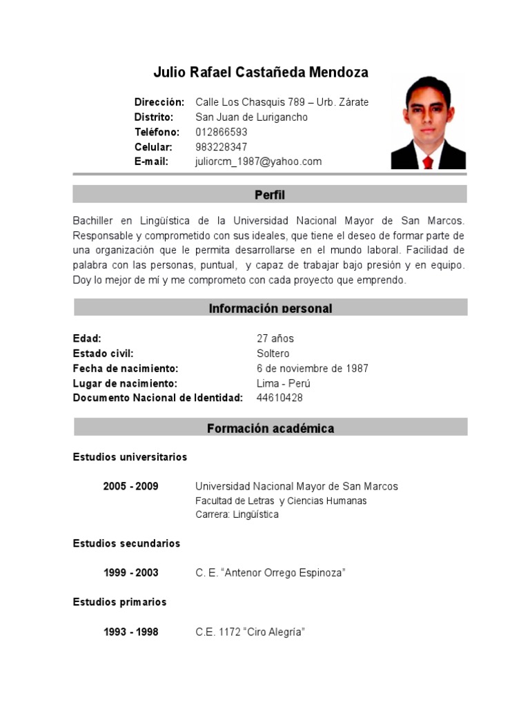 Currículum Vitae Ejemplos Peru - Ejemplos De Curriculum Vitae Hechos Sin Experiencia ... - Crear un curriculum vitae profesional.. Abre tu word.elige una tipografía sencilla y estructura la información de. Cómo hacer un cv de ingeniero civil que cuáles son las secciones imprescindibles de un currículum vitae de ingeniero civil. En este artículo te enseñamos cómo redactar un modelo de currículum de tipo funcional. Ejemplos de curriculum vitae por tipos. Encuentra tu ejemplo de currículum adaptado a tu profesión.